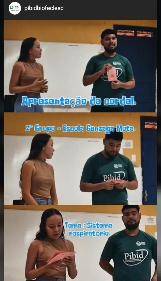 07/03/2025 – No dia em questão realizou-se a postagem na plataforma Instagram, em formato de reels. A publicação consistia em um vídeo sobre a produção de cordel da segunda equipe da escola Gonzaga Mota, que tinha como título Sistema respiratório.