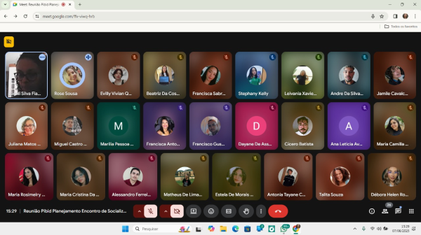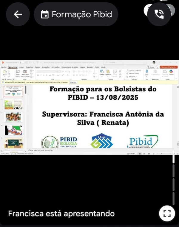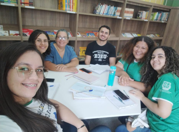 07/08/2025 – Na tarde do dia 07, os bolsistas do núcleo de biologia tiveram uma reunião com a coordenadora de área Jamili Fialho, juntamente das professoras supervisoras Francisca Antônia (Renata), Juliana Matos e Rose Sousa, de suas referentes escolas EEM Gonzaga Mota, José Bonifácio e Padre Vicente, para planejar o evento de socialização do PIBID, o qual acontecerá de seis em seis meses, com enfoque na mostra e exposição das atividades realizada pelos bolsistas, na reunião separamos as últimas atividades pendentes para concluirmos e realizarmos para a socialização.