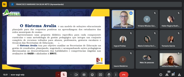 A professora que estava ministrando a formação explicou o modo de funcionamento, ou seja, como a Secretaria de Educação tinha planejado os módulos de uma forma que ficassem sincronizados com o plano de ensino anual de cada turma, assim os professores conseguiriam conciliar o que o Sistema Avalia propõe de acordo com o conteúdo do livro didático planejado para cada período.