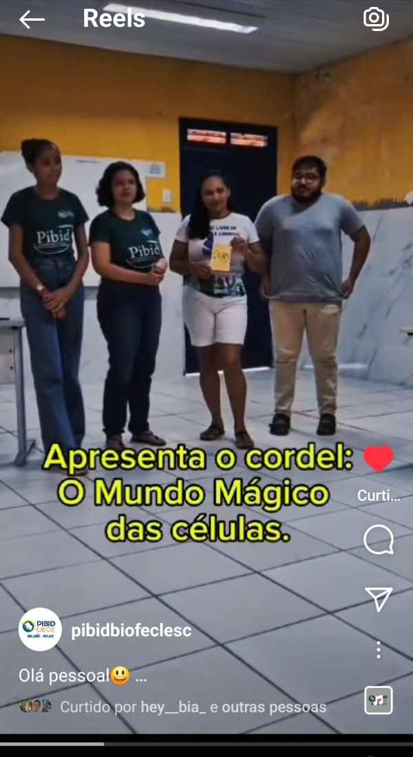 28/02/2025 – Post sobre a apresentação do cordel: O mundo mágico das células. O post/reels e cordel foi desenvolvido pelos BIDS: Jamile Cavalcante, Sabrina Oliveira, Leivania Xavier e Cícero Romão, da escola Gonzaga Mota.