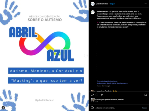 25/04/2025 – Na sexta-feira do dia 25, a bolsista Jamile Da escola Gonzaga Mota, produziu um post acerca da conscientização sobre o autismo.