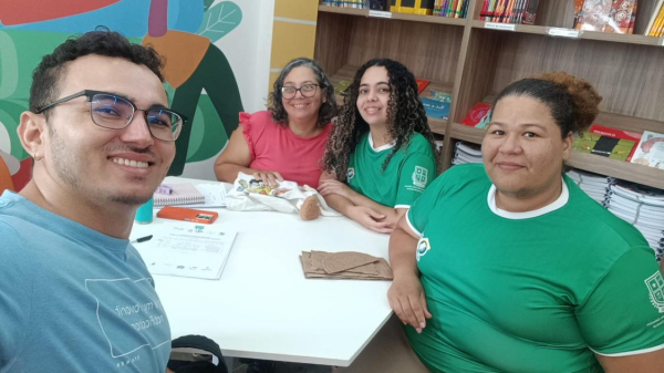 Na imagem estão presentes as bolsistas Camilla e Sara, a professora preceptora Rose e a formadora da secretaria Viviane.