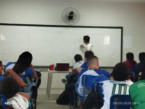 30/04/2025: (José Bonifácio) – O bolsista Alessandro na sua regência, nas turmas do 7° C e D, abordou os fenômenos naturais: terremotos, vulcões e tsunamis. A aula teve início com uma breve retomada do conteúdo da aula anterior, ministrada pela professora Juliana Matos, sobre placas tectônicas.