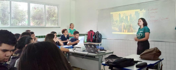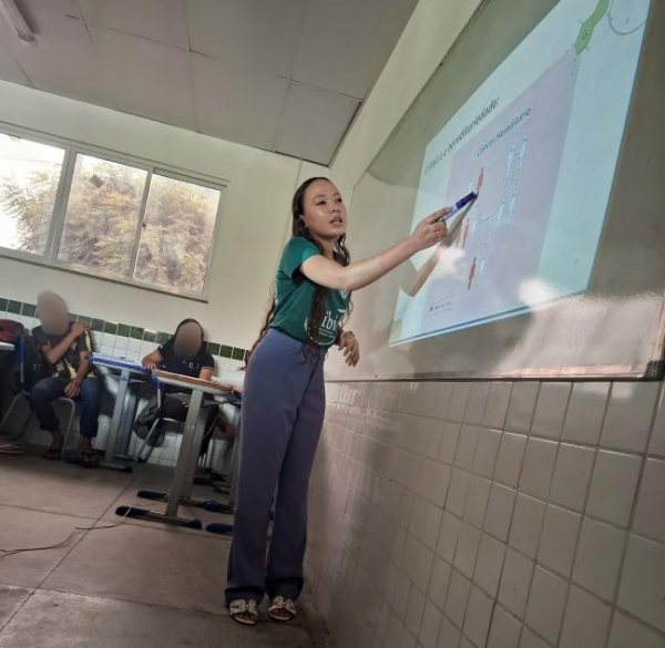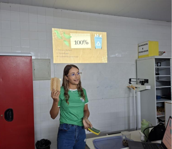 10/06/2025 – Regência sobre a Bucha Vegetal na turma da 3º série D pela bolsista Helen, na escola Gonzaga Mota.