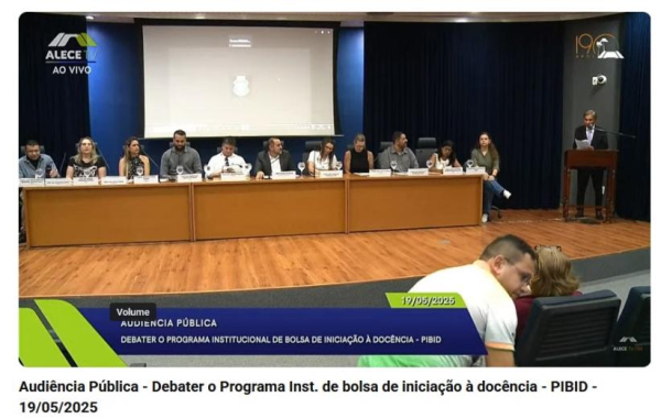 19/05/2025: PIBID: Audiência Pública – Debater o Programa Inst. de bolsa de iniciação à docência. A Assembleia Legislativa do Ceará realizou uma audiência pública para realçar a importância do PIBID (Programa Institucional de Bolsa de Iniciação à Docência).