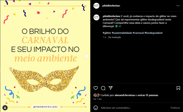 17/02/2025 – (Padre Vicente): Publicação no Instagram sobre o uso de Glitter no Carnaval. A importância da conscientização do grau de impacto que causa o glitter no carnaval e o uso do glitter biodegradável.