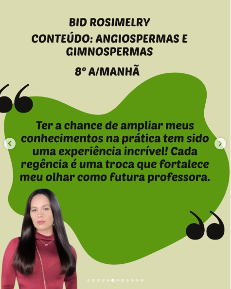 16/05/2025: (José Bonifácio) – Regência Rosimelry 8° ano A e B; O conteúdo abordado na regência da bolsista Rosimelry foi sobre os grupos de plantas Gimnospermas e Angiospermas abordando os ciclos reprodutivos, polinização e algumas espécies de plantas dos respectivos grupos por meio de imagens.