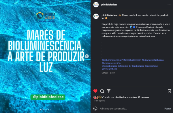 15/08/2025- Post no Instagram elaborado pelo bolsista Cícero Batista da escola Gonzaga Mota, com foco na temática de Bioluminescência, um fenômeno natural que desperta curiosidade e encanta pela sua beleza singular.