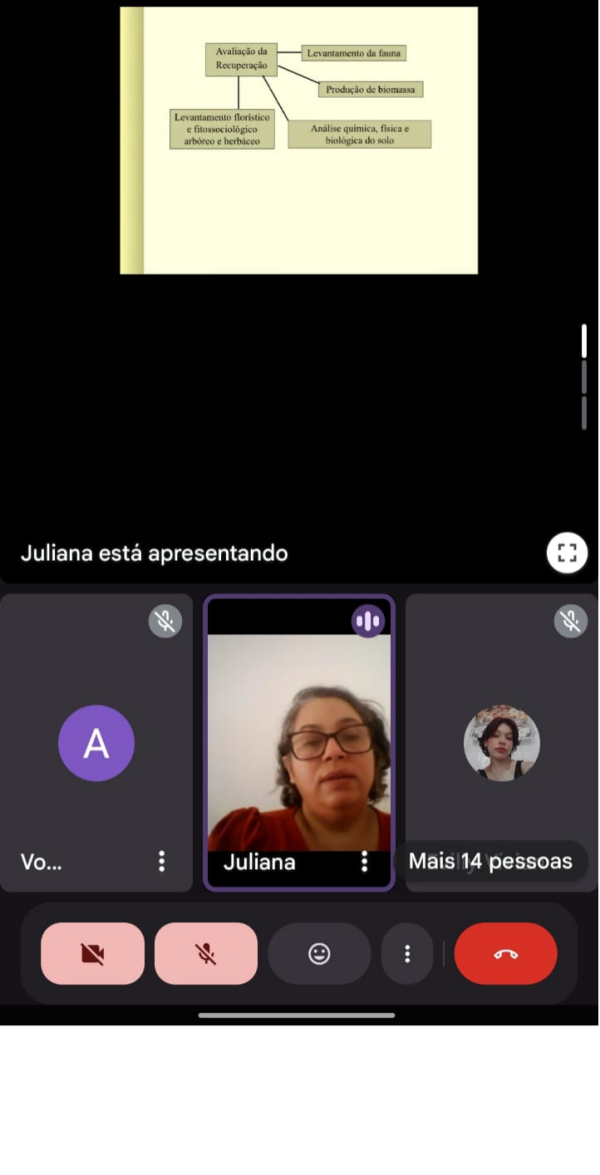 19/08/2025 – formação em que a supervisora Juliana apresentou sua pesquisa de mestrado intitulada “Revegetação de Áreas Antropizadas da Caatinga com Espécies Nativas”. Ela trouxe informações importantes sobre a composição das florestas, o funcionamento dos ecossistemas e os impactos que os afetam diretamente.