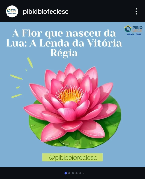 22/08/2025- Post no Instagram desenvolvido pela bolsista Stephany Kelly, da escola Gonzaga Mota, com o tema: “A Flor que Nasceu da Lua: A Lenda da Vitória-Régia”, um mito de origem dos povos da Amazônia (Tupi), que mistura natureza, cultura e poesia.