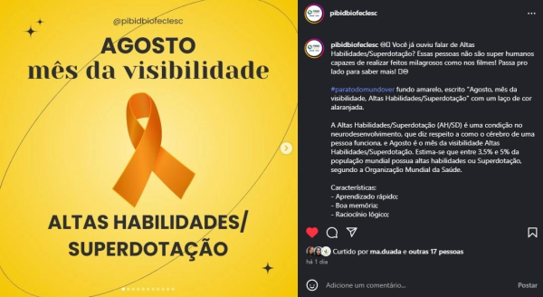 25/08/2025 (Padre Vicente): Postagem no Instagram sobre o Mês da Visibilidade de Altas Habilidades/Superdotação, com informações pertinentes sobre essa condição.