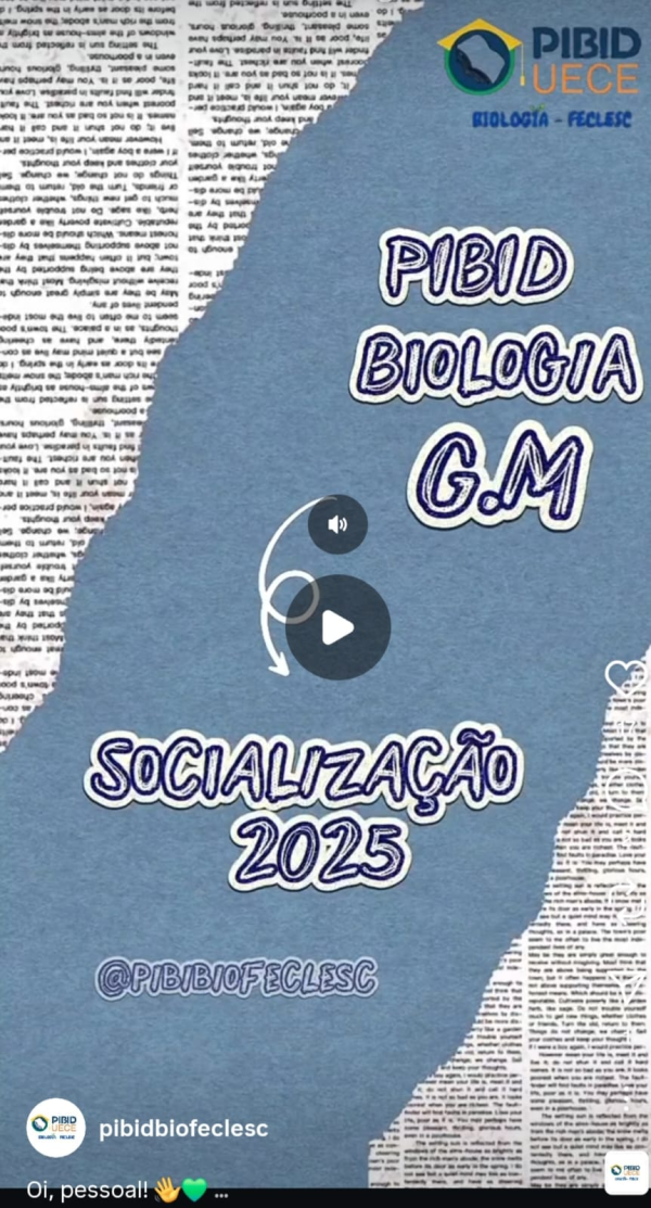 29/08/2025- Post no Instagram sobre a Socialização dos Resultados do PIBID, produzido pela bolsista Stephany da escola Gonzaga Mota. O post consiste em um vídeo publicado em forma de reels do Instagram, uma gravação do momento de socialização dos resultados do PIBID, especificamente, a interação dos bolsistas com a Coordenadora Institucional da UECE, Profa. Jaqueline Rabelo.