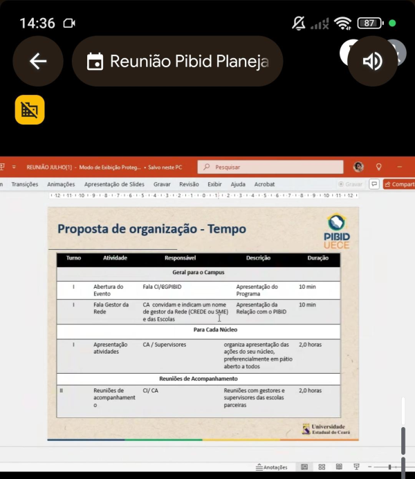 Na quinta-feira, dia 9 de janeiro, aconteceu a reunião com nossa coordenadora do PIBID, que teve como objetivo continuar o compartilhamento do estudo crítico do Projeto Político Pedagógico (PPP) das escolas onde ocorreu um momento de troca de ideias, reflexões coletivas, dúvidas e curiosidades. Também tivemos a apresentação do novo cronograma do programa, que foi mostrado o que vamos fazer semestre por semestre. Desde observações em sala de aula, até nossas regências. Também foi pedido para fazer um portfólio individual com início em fevereiro, para observar nossas atividades na bolsa.