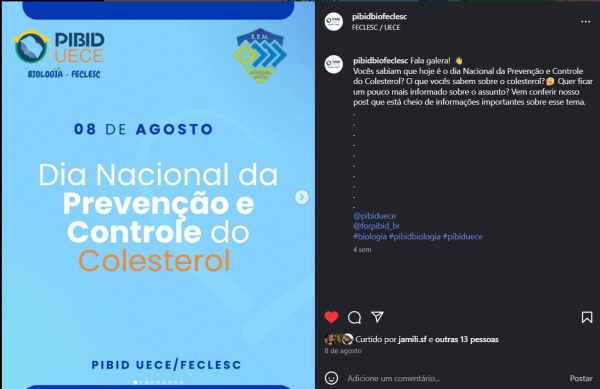 08/08/2025 – Post no Instagram (Dia Nacional da Prevenção e Controle do Colesterol) produzido pela bolsista da escola Gonzaga Mota Leivânia Xavier. O post foi desenvolvido para ser publicado no dia 8 de agosto, que é o Dia Nacional da Prevenção e Controle do Colesterol. A postagem trouxe as seguintes informações: o que é o colesterol; quais os tipos de colesterol; formas de obtenção; quais problemas de saúde podemos desenvolver por causa do colesterol; as causas das alterações nos níveis; formas de prevenção e tratamento.