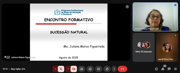 12/08/2025 – Encontro de formação com a professora supervisora Juliana que compartilhou seus conhecimentos sobre sucessão ecológica, temática do seu mestrado. Ela explicou como esse processo natural ocorre gradualmente nos ecossistemas, passando por diferentes estágios até alcançar o equilíbrio, conhecido como clímax. Durante a fala, destacou exemplos práticos e relacionou o conteúdo à realidade escolar, mostrando como o tema pode ser trabalhado em sala de aula de forma contextualizada. Sua contribuição enriqueceu a formação, aproximando a teoria acadêmica da prática docente.