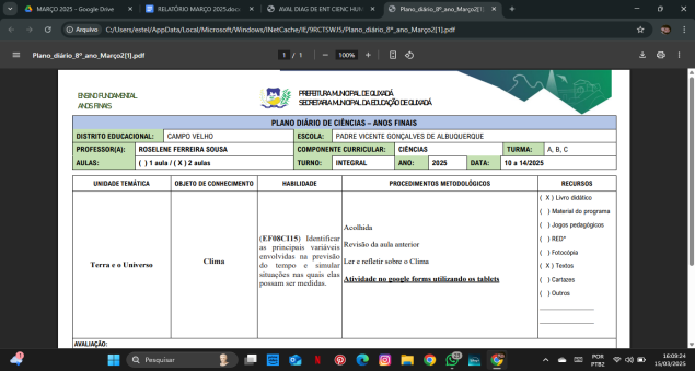 10/03/2025:( Padre Vicente) Durante o planejamento a supervisora nos mostrou como funciona o sistema online da escola. Foi abordado sobre a prova diagnóstica do avalia para 9° e 8° ano, que serve para avaliar o conhecimento dos alunos.