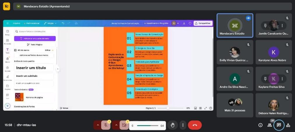 11/03/2025 – Nesse dia deu início ao workshop de design gráfico, o palestrante falou sobre como seria o andamento do workshop, falando sobre frequência, andamento do evento, e a plataforma onde seria feito os encontros posteriores. O workshop se prolongou pelos dias 11, 12, 13 e 14 de março de 2025.
