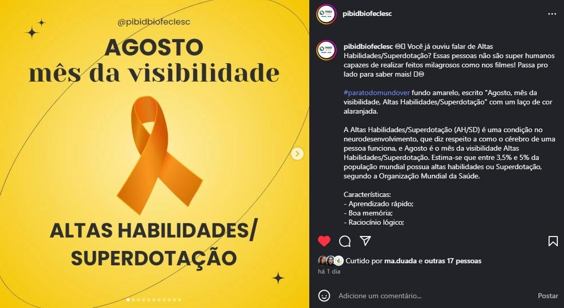 25/08/2025 (Padre Vicente): Postagem no Instagram sobre o Mês da Visibilidade de Altas Habilidades/Superdotação, com informações pertinentes sobre essa condição.