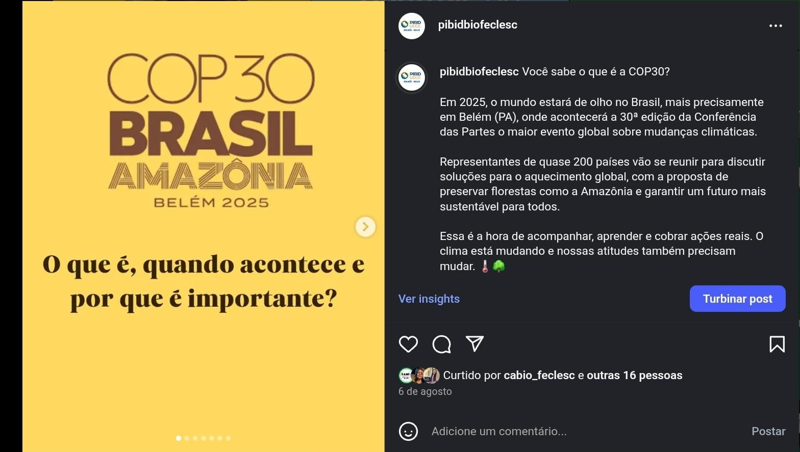 06/08/2025: (Padre Vicente): realizada postagem no Instagram abordando a definição de COP 30, quando acontece, quem participa, onde vai acontecer, quais as propostas e por que é importante.