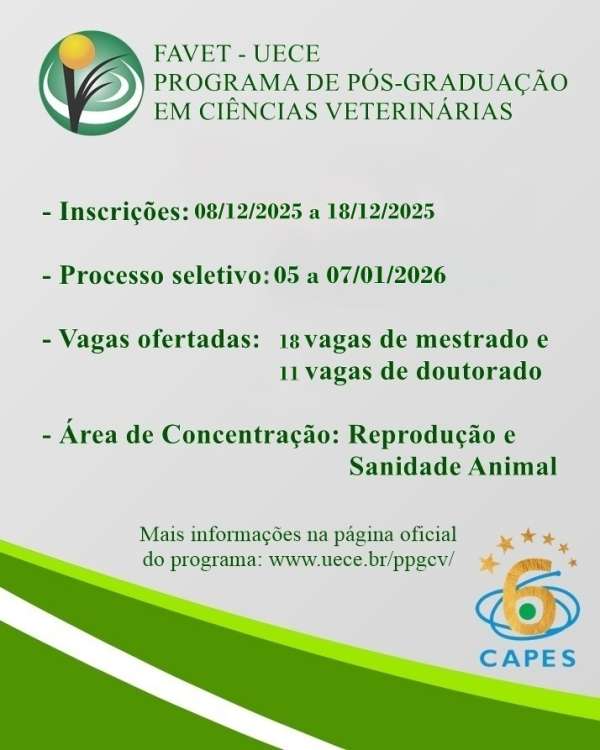 O Programa de Pós-Graduação em Ciências Veterinárias abrirá nova seleção em dezembro de 2025, com inscrições de 08/12/2025 a 18/12/2025.