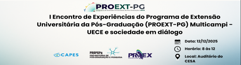 Criado de forma inédita pela Capes e pela SESU/MEC, por meio da Portaria Conjunta nº 1/2024, o PROEXT-PG integra as Diretrizes para a Extensão na Educação Superior, regulamentadas pela Resolução nº 7/2018 do Conselho Nacional de Educação. A UECE foi uma das 48 instituições do Nordeste contempladas e iniciou suas atividades no programa em 2024, com vigência até 2028. Atualmente, 13 Programas de Pós-Graduação da instituição desenvolvem ações integradas ao PROEXT-PG.
