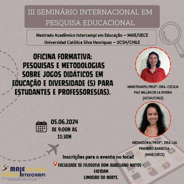 O MAIE (Mestrado Acadêmico em Educação e Ensino) e a UCSH (Universidade Católica Silva Henríquez) estão promovendo o III Seminário Internacional de Pesquisa Educacional nos dias 4 e 5 de Junho de 2024, o qual terá mesas redondas, defesa de dissertação, oficina e visita ao acampamento Zé Maria do Tomé. As inscrições poderão ser feitas no local e será garantido certificado.