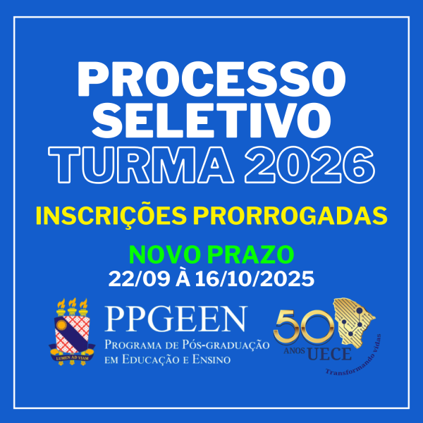 O Programa de Pós-Graduação em Educação e Ensino (PPGEEN/UECE) informa que as inscrições para o Processo Seletivo da Turma 2026 foram prorrogadas.