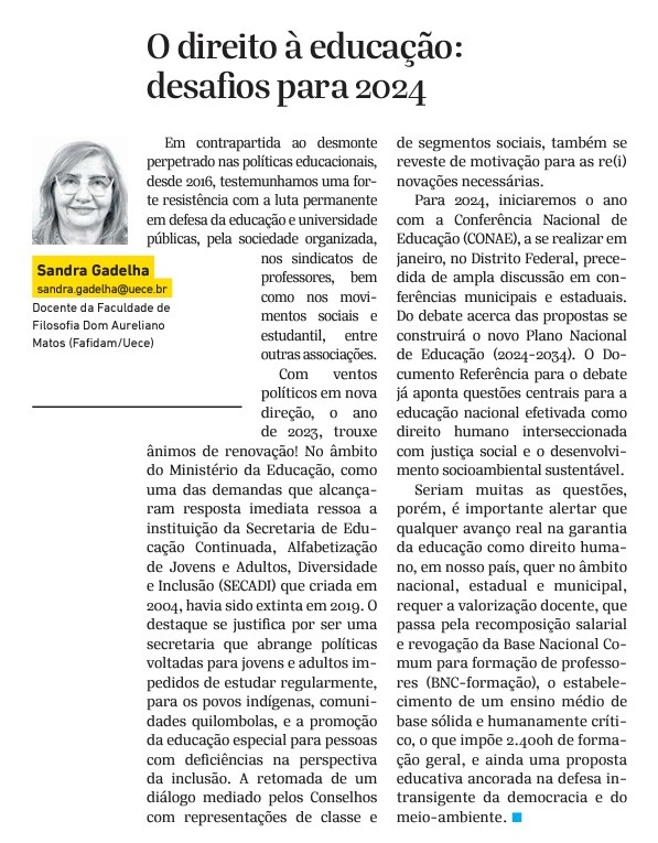 Professora Sandra Gadelha publica artigo no Jornal O Povo