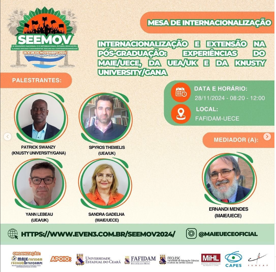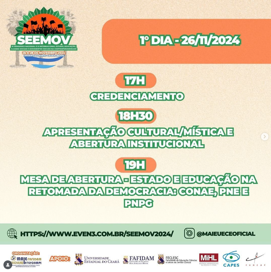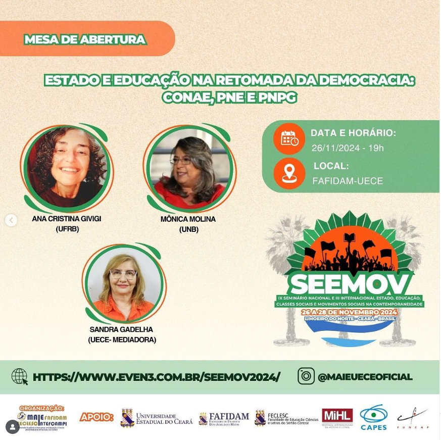 O Seminário Estado, Educação, Classes e Movimentos Sociais na Contemporaneidade tem por finalidade possibilitar a reflexão e o debate sobre questões atuais relativas à educação brasileira frente às diversas conjunturas sociais, econômicas, políticas e culturais vivenciadas, em diálogo com as investigações desenvolvidas no âmbito das linhas de pesquisa do Programa de Pós-Graduação em Educação e Ensino (PPGEEN), situado no semiárido cearense e instituído, em 2013, como o primeiro mestrado e doutorado acadêmico em Educação da Universidade Estadual do Ceará (UECE), no interior do estado. Em que pese a sólida formação teórica constitutiva do currículo do curso, o aprofundamento da análise de temáticas contemporâneas relativas tanto às políticas educacionais, formação docente e escola, quanto à atuação dos movimentos sociais na luta por educação e/ou no desenvolvimento de projetos de educação popular, se apresentou como uma demanda na dinâmica formativa do curso.