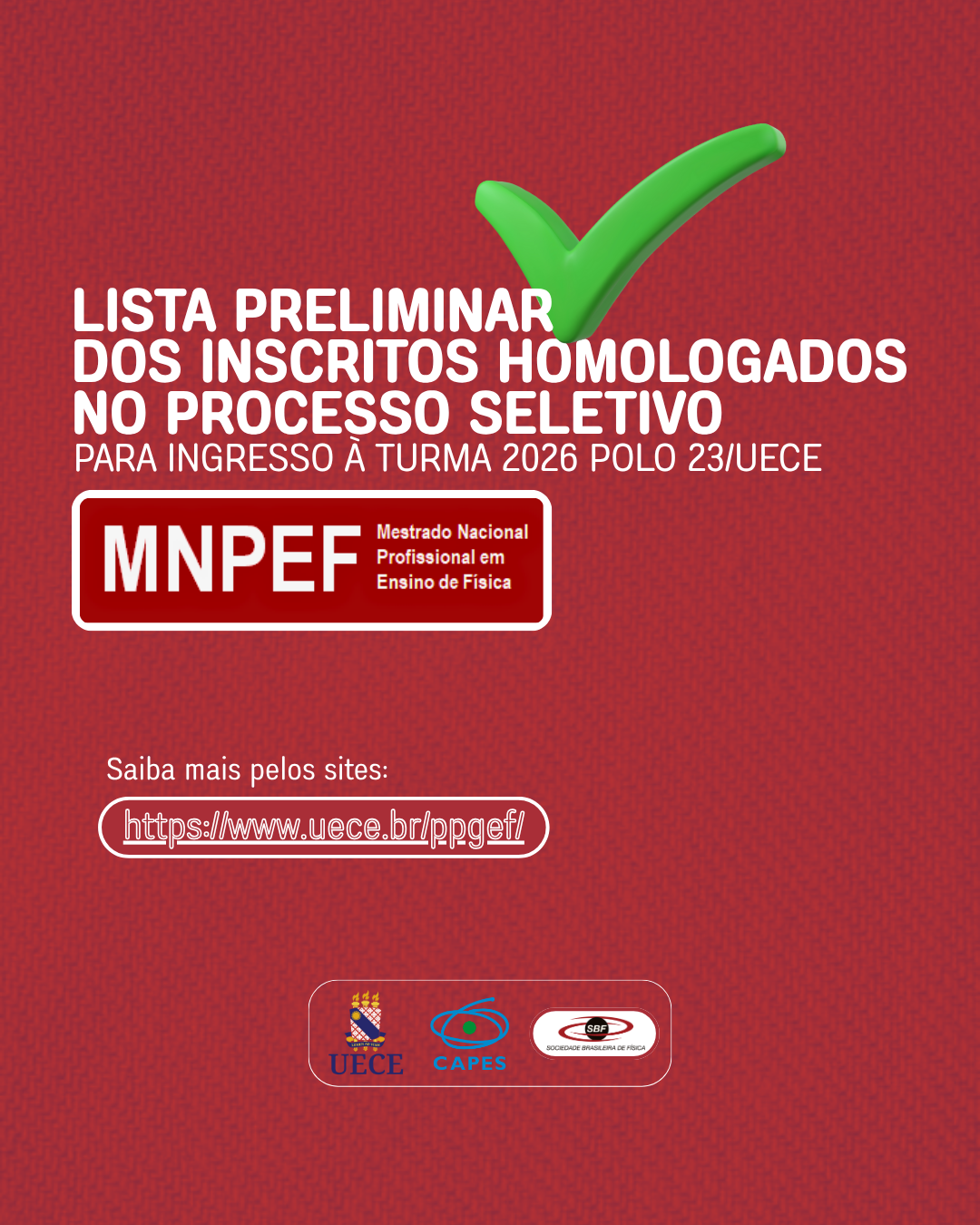 O Mestrado Profissional em Ensino de Física, vinculado à Universidade Estadual do Ceará, divulga a lista preliminar dos inscritos homologados para o processo seletivo de ingresso à turma 2026.