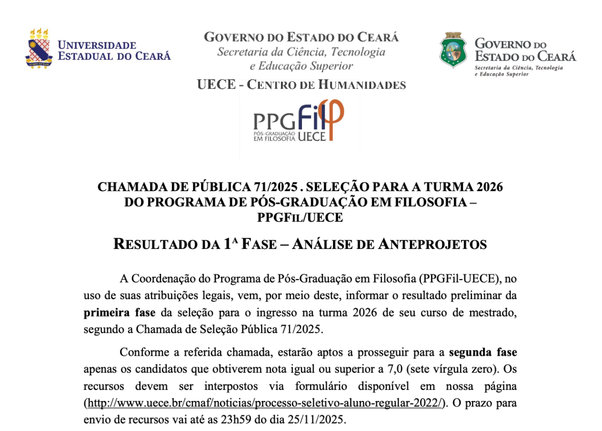 A Coordenação do Programa de Pós-Graduação em Filosofia (PPGFil-UECE), no uso de suas atribuições legais, vem, por meio deste, informar o resultado preliminar da primeira fase da seleção para o ingresso na turma 2026 de seu curso de mestrado, segundo a Chamada de Seleção Pública 71/2025.
