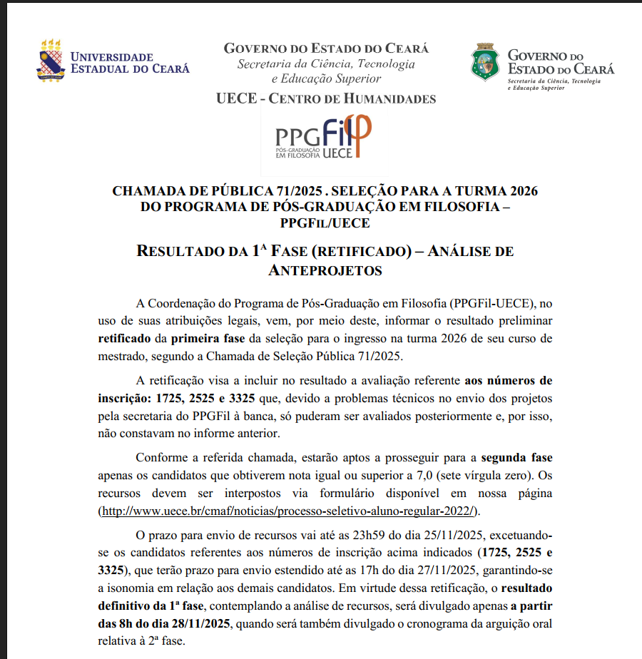 A Coordenação do Programa de Pós-Graduação em Filosofia (PPGFil-UECE), no uso de suas atribuições legais, vem, por meio deste, informar o resultado preliminar retificado da primeira fase da seleção para o ingresso na turma 2026 de seu curso de mestrado, segundo a Chamada de Seleção Pública 71/2025. A retificação visa a incluir no resultado a avaliação referente aos números de inscrição: 1725, 2525 e 3325 que, devido a problemas técnicos no envio dos projetos pela secretaria do PPGFil à banca, só puderam ser avaliados posteriormente e, por isso,