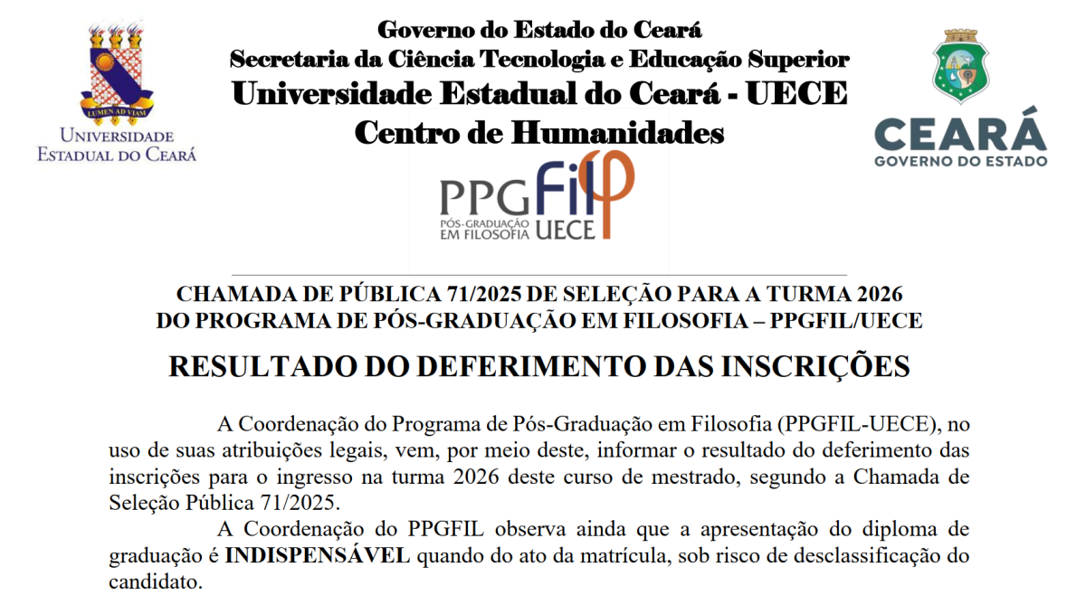 A Coordenação do Programa de Pós-Graduação em Filosofia (PPGFIL-UECE), no uso de suas atribuições legais, vem, por meio deste, informar o resultado do deferimento das inscrições para o ingresso na turma 2026 deste curso de mestrado, segundo a Chamada de Seleção Pública 71/2025.
