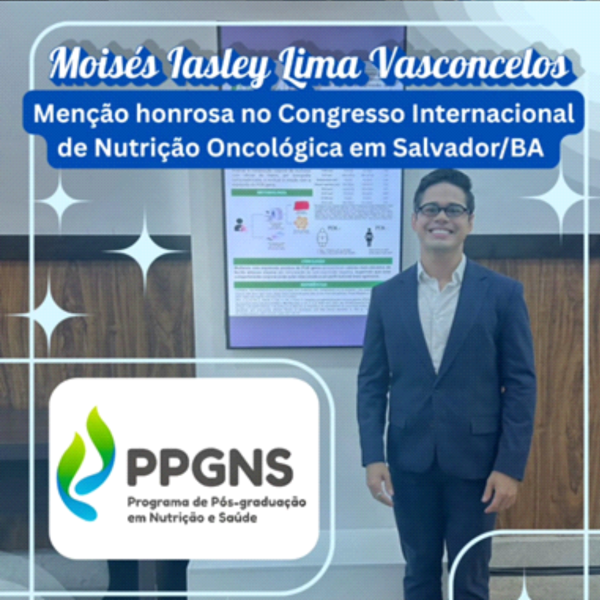 O mestrando Moisés Iasley Lima Vasconcelos do PPGNS foi reconhecido com menção honrosa no Congresso Internacional de Nutrição Oncológica em Salvador/BA. Seu trabalho ” Composição Corporal por fonográfica computadorizada em mulheres com câncer de mama: comparação segundo a expressão do PI3K gama” foi premiado. O estudo destaca a importância da análise da composição corporal do paciente oncológico e relacionando com marcadores de agressividade tumoral.