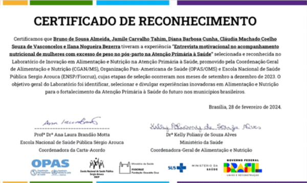 Os egressos do PPGNS, Bruno de Sousa Almeida e Jamile Carvalho Tahim e as docentes Cláudia Machado Coelho Souza de Vasconcelos e Ilana Nogueira Bezerra tiveram o trabalho “Entrevista motivacional no acompanhamento nutricional de mulheres com excesso de peso no pós-parto na Atenção Primária à Saúde” selecionado e reconhecido no Laboratório de Inovação em Alimentação e Nutrição na Atenção Primária à Saúde, promovido pela Coordenação Geral de Alimentação e Nutrição (CGAN/MS), Organização Pan-Americana de Saúde (OPAS/OMS) e Escola Nacional de Saúde Pública Sergio Arouca (ENSP/Fiocruz). Também é co-autora do trabalho a Profa. Diana Barbosa Cunha do Instituto de Medicona Social da UERJ.