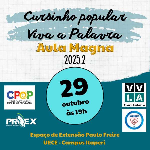 O Cursinho Popular Viva a Palavra, vinculado ao Programa de Extensão de mesmo nome, realiza nesta quarta-feira, 29 de outubro, às 19h, sua Aula Magna do semestre 2025.2, no Espaço de Extensão Paulo Freire, no campus Itaperi da Universidade Estadual do Ceará (UECE).