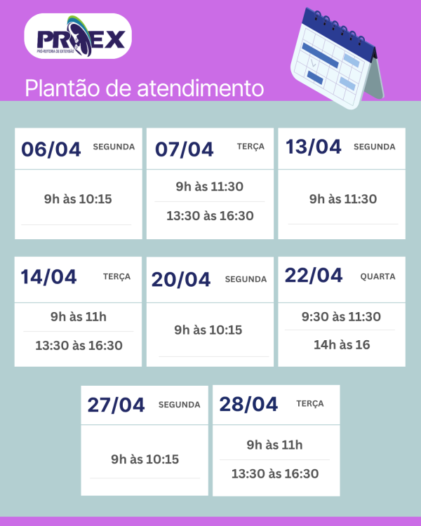 ✨Calendário de Abril – Plantão de Atendimento da Extensão ✨