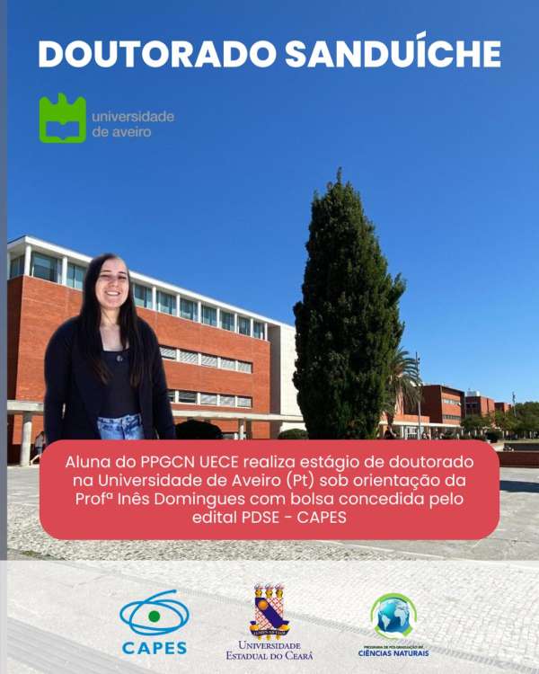 Já a doutoranda Milena Lira Furtado, também do PPGCN/UECE, realiza Estágio Doutoral na Universidade de Aveiro (Portugal), sob a orientação da Profa. Dra. Inês Domingues, com bolsa concedida por meio do Programa Institucional de Doutorado Sanduíche no Exterior (PDSE) – CAPES.